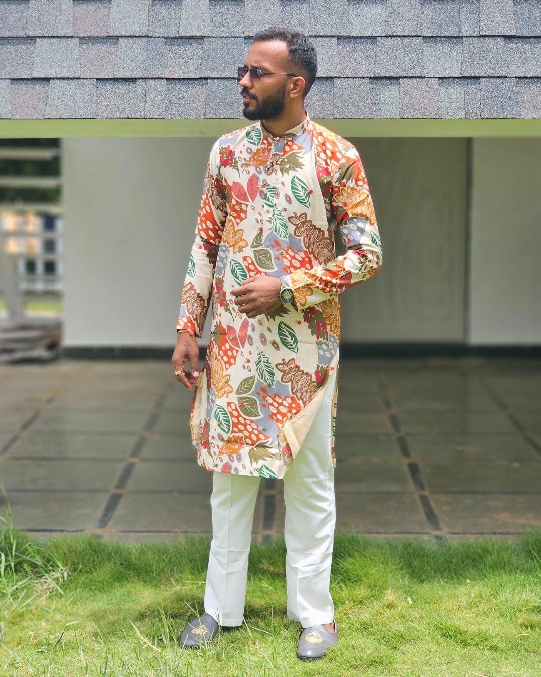 A sophisticated men's kurta showcasing rich autumn colors with botanical leaf patterns and mushroom motifs on a cream base. This contemporary design blends traditional silhouette with modern botanical prints, ideal for casual occasions and seasonal celebrations.