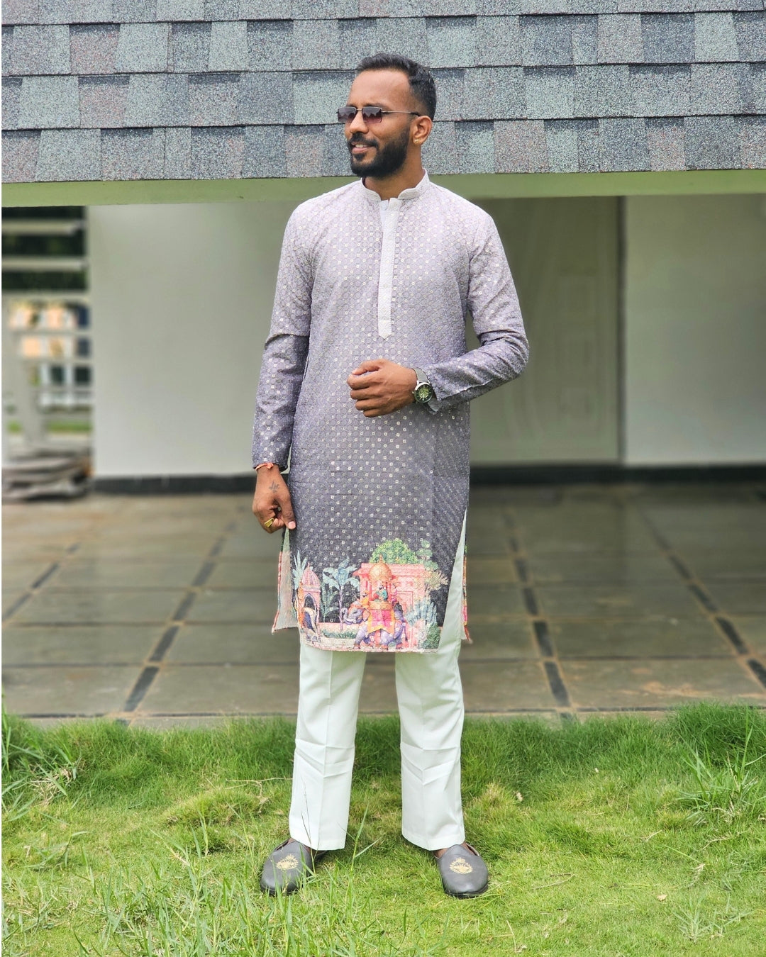 Majestic grey kurta showcasing royal elephant motifs with vibrant traditional artwork.