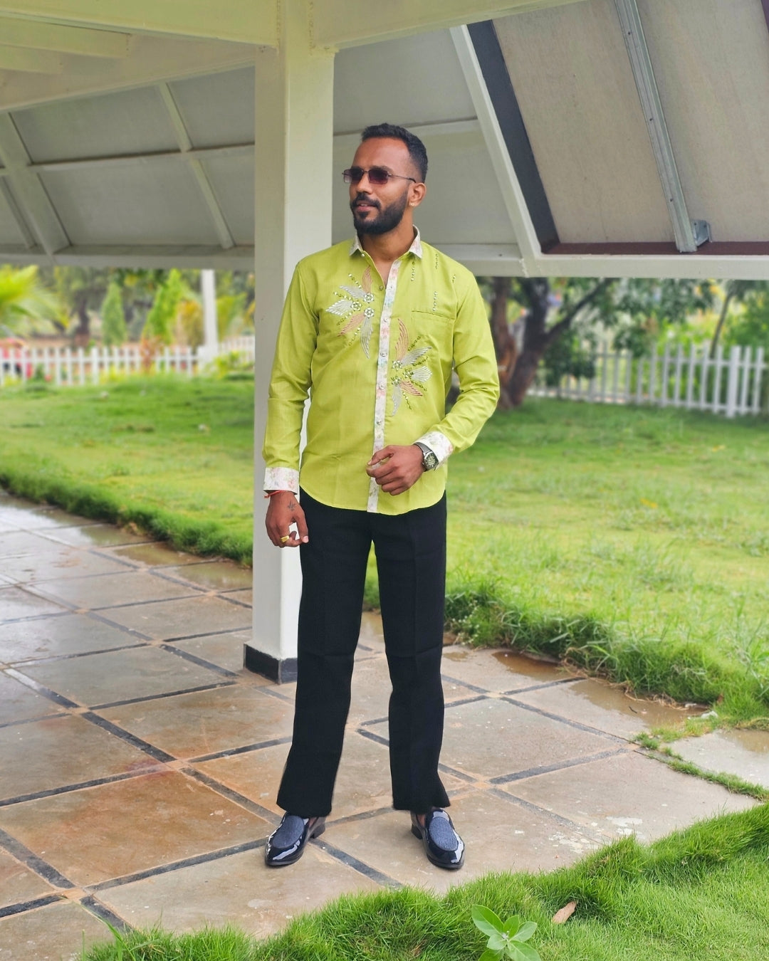 Classic Jethalal-inspired shirt with beautiful embroidered floral motifs and decorative studs, perfect for ethnic wear and special occasions.