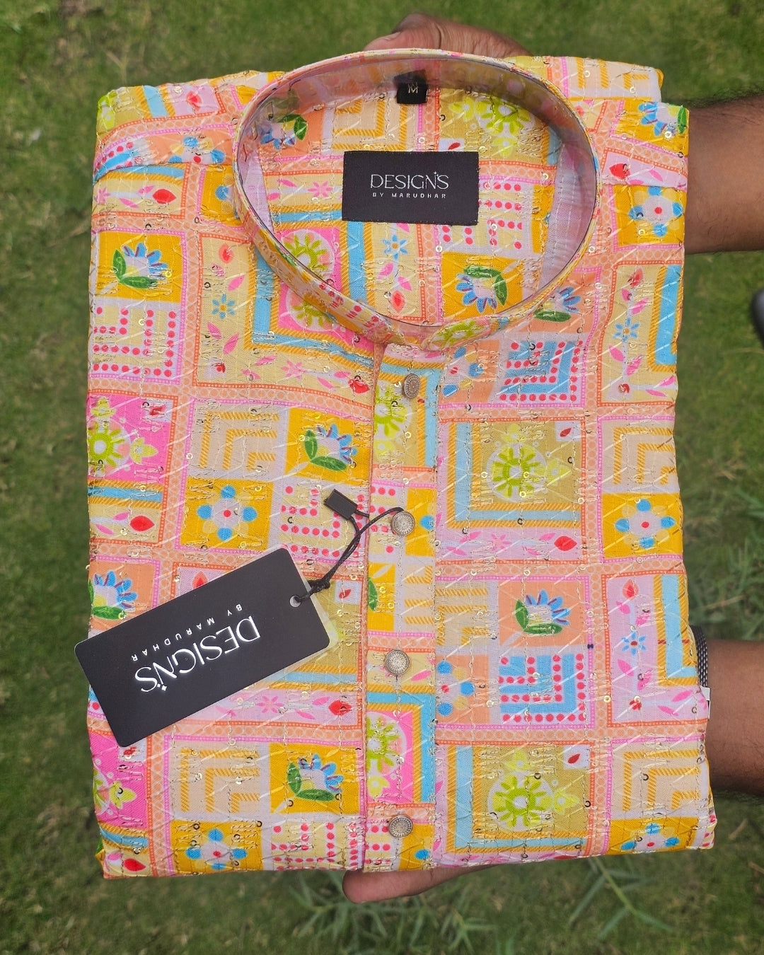A stunning men's kurta featuring a colorful patchwork design with intricate floral motifs and geometric patterns. This eye-catching piece combines traditional Indian craftsmanship with contemporary style, perfect for festive occasions and cultural celebrations.